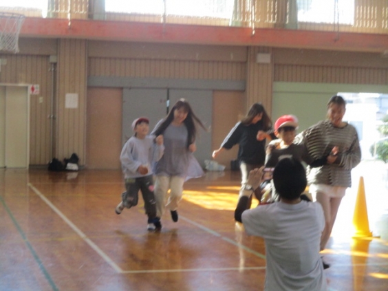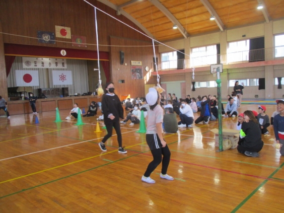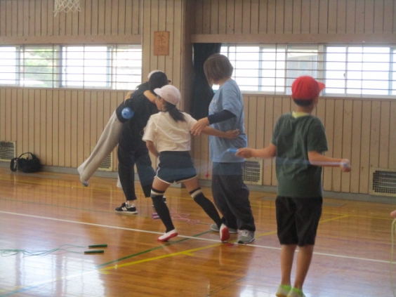 5年生は、親子学習会でミニ運動会がありました。障害物競走では、マットの上を袋に入って子ども達がジャンプで進みます。次は縄跳びを跳びながら走り、保護者が風船を膨らませるまで跳び続けます。
