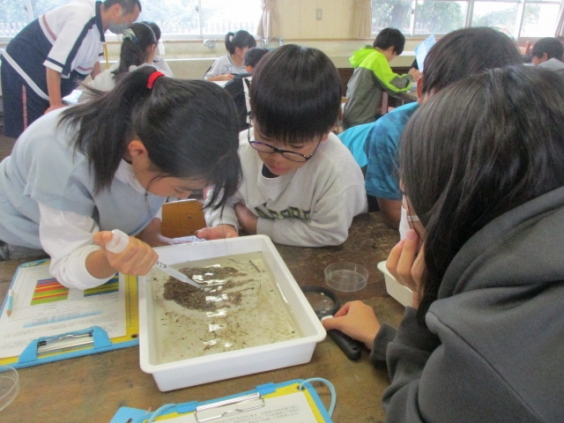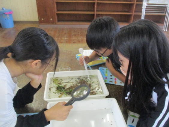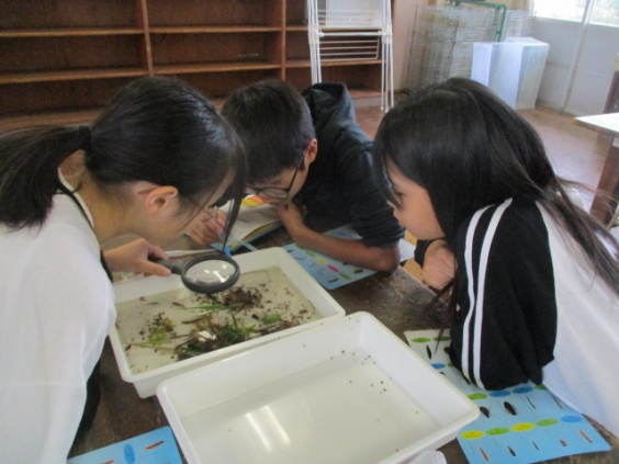 そして、水生生物の資料を見て学習した後、川から採取した生物を実際にルーペで観察する様子は興味津々で、ヤゴやカワニナ、トビゲラなど名前が判明するたびに、興奮して声が弾んでいました。