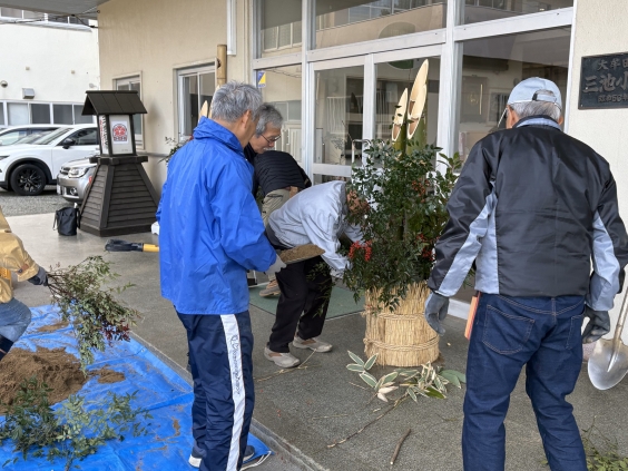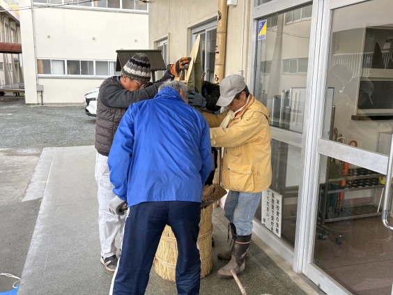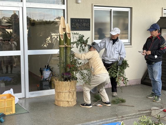 後期前半も残りわずかとなりました。朝、夕の寒さからは年の瀬がいよいよ近づいていることを肌で感じます。 本年も大牟田市退職小学校長会の先生方に立派な門松を作っていただきました。 まっすぐに伸びた緑の竹の周りに笹や葉牡丹や南天などが美しく飾ってある見事な門松です。学校の玄関がきらびやかになり、子どもたちも大喜びです。来校の際には、ぜひご覧ください。