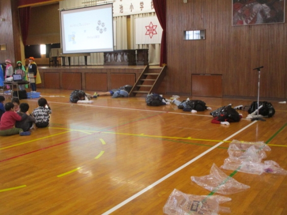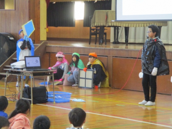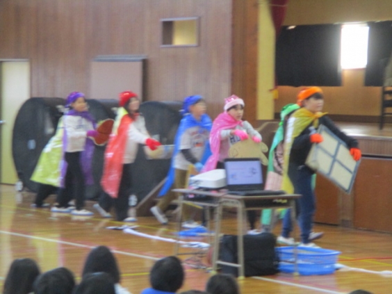 今日は、児童集会で保健委員会がウイルスに負けないための対策を劇にして発表しました。 ウイルスとみいけっこ7レンジャーが対決する劇に、子ども達は大喜びです。換気、十分な睡眠、手洗い、うがい、バランスよい食事、元気に外遊び、マスク着用などの大切さを伝えました。 話す時、せきやくしゃみをする時の飛沫の跳ぶ距離を実際に見て、「えー!そんなに〜!」と驚きの声が上りました。最後にみいけっこ7レンジャーがウイルスを倒すと大歓声が上がり、楽しく病気の予防を学ぶことができました。