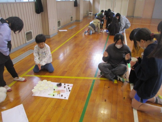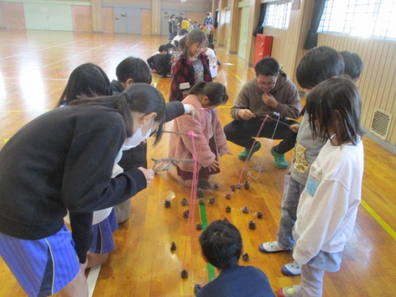 1年生は、生活科で秋を見つける学習をしました。見つけた松ぼっくりやどんぐりを使っておもちゃを作りました。そして、秋のおもちゃ祭りを開催して、いつもお世話になっている6年生を招待しました。