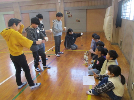 1年生は、「いつもありがとう」「バレーボールがんばって」の気持ちをこめて、精一杯おもてなしをしました。どんぐりのすごろくや的当てやコマ、松ぼっくり釣りなど、おもちゃの紹介をしました。
