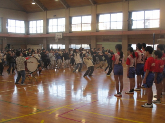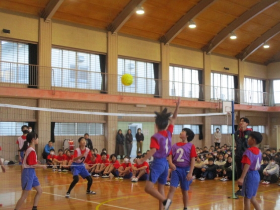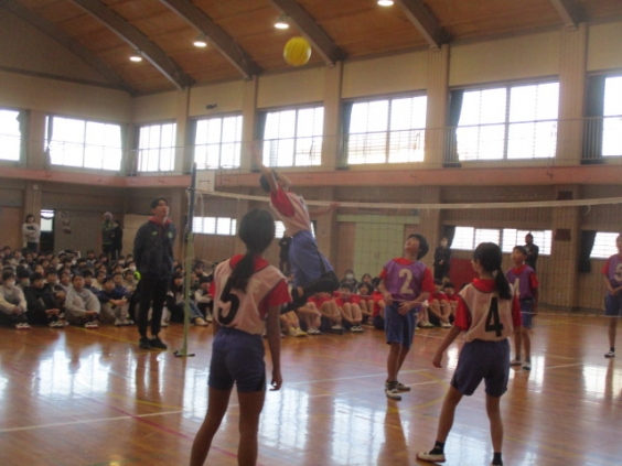 1年生から5年生までの子ども達は、親睦球技大会に行く6年生を壮行会で応援しました。5年生が応援団として下級生にリーダーシップをとり練習をして、6年生にパワーを送るためにみんなで腰を反らして大きい声を体育館に響かせて応援しました。 応援を受けて更に気合が高まった6年生は、1年生から5年生の前でバレーを披露しました。一つ一つのプレーに熱い声援が響く中、三池小学校全体が一つに団結したのを感じました。