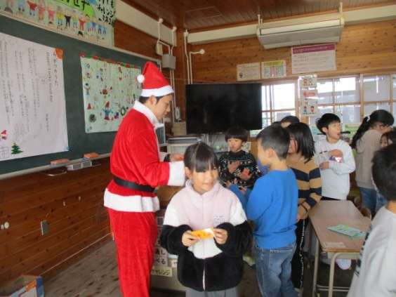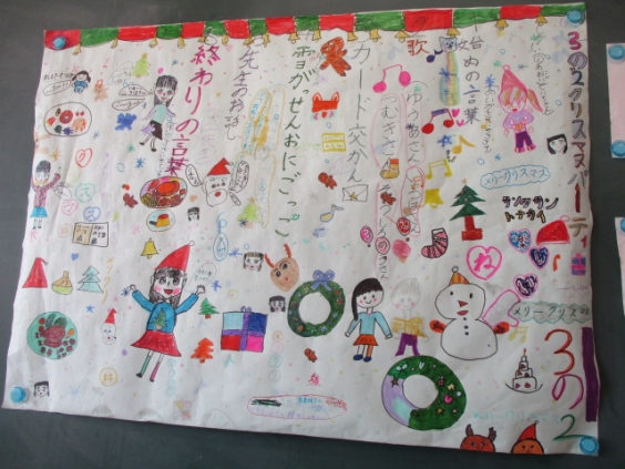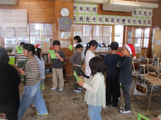 3年生は、事前に準備をして心待ちにしていたお楽しみ会をしました。どちらのクラスも教室の飾りつけや遊びの工夫があり感心しました。体育館いっぱいを使ってする雪合戦おにごっこで走り回る姿やカード交換でもらったカードを嬉しそうに読む姿などが見られました。サンタに扮した先生から栞のプレゼントをもらうなど、嬉しいサプライズもありました。 最後に、子ども達の笑顔がはじけるクラス写真を撮りました。友達との思い出に残る、とても温かい時間になりました。