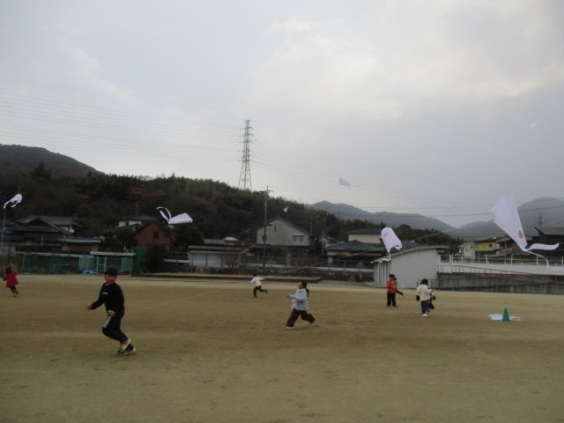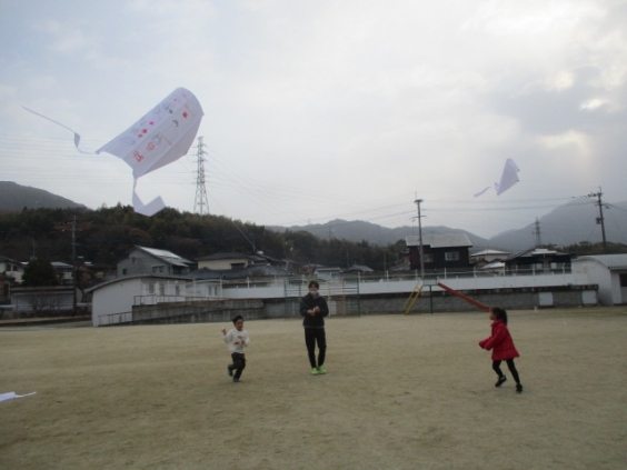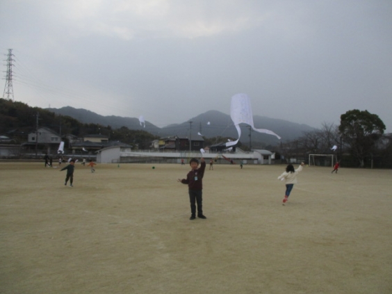 1年生は、生活科の「ふゆとあそぼう」で凧を作り、凧あげをして遊びました。タコやお花など思い思いの絵を描いて、個性が表れていました。始めは糸を短く持って凧あげしていた子ども達は、風を上手く使うコツをつかむと、糸を長くして楽しそうに走り回りました。 雪空の下、「見て見て!こんなに高いよ!」「先生、見て。タコの凧!」と、元気いっぱいの1年生の声が響いていました。