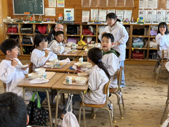 見守り隊の方も「おいしくいただきました。みんなと話ができて、エネルギーをいただきました。」「みなさん元気で明るい雰囲気で元気をもらいました。また来てくださいの子どもたちの言葉に感謝です。」「子どもたちと一緒に昼食を食べる機会は、素晴らしい企画です。」と感想をいただき、とてもよい給食試食会になったと思います。