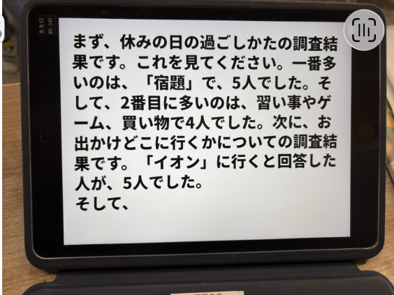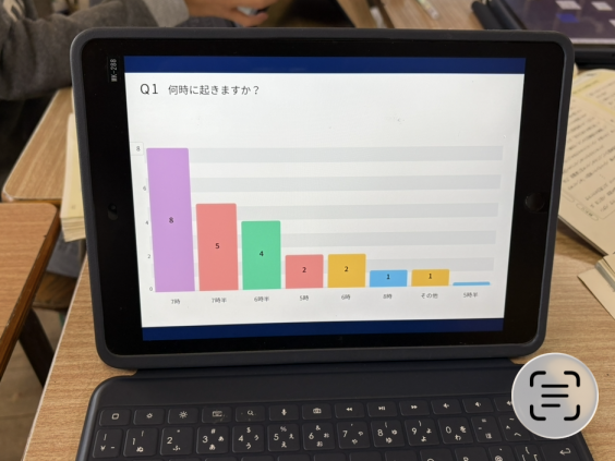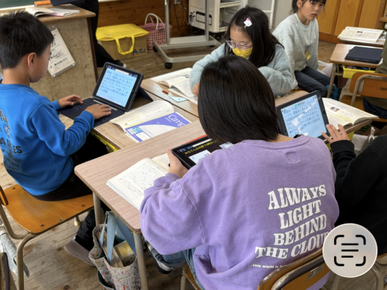 4年生の国語の学習「調べて話そう、生活調査隊」の様子です。この学習は、ふだんの生活の中で疑問に思うことを調べて発表をする学習です。今日は発表の原稿づくりを行っていました。タブレット端末を上手に使い、調べた結果をグラフにまとめたり組み立てを考えて原稿を作ったりしています。また、タブレット端末にあるグループで協働で作業ができる機能を使いながら、グループの仲間とともに学習を進めています。