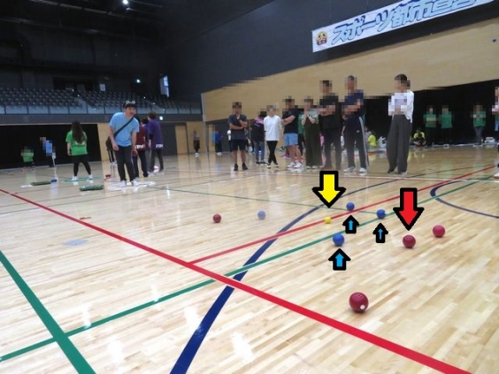 投げる技能(黄色いボールに寄せる技能)はもとより、相手のボールを避けるために・・・など作戦も重要なスポーツです。