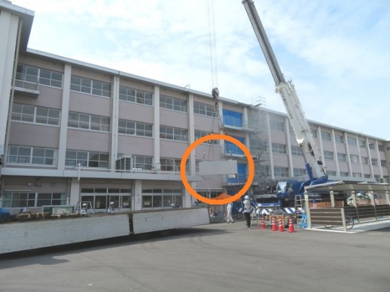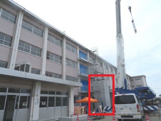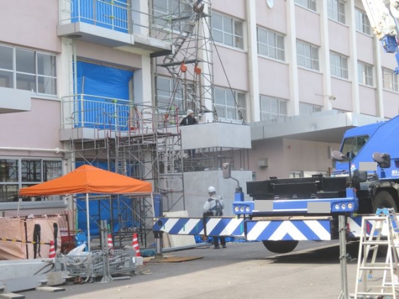 教頭 三浦です。 8月21日〜22日 大型重機(クレーン車)が入り、エレベーター外壁の設置が行われました。 大きなトラックに一つずつ積まれたコンクリートブロックをクレーンで吊り上げ、設置していきます。穴が開いており、下から伸びている鉄筋を穴に通しながら、ずれなく積まれていく姿は圧巻です。 現在工事は順調に進んでおり、年内に完成しそうです。 (検査等もあるので、使われるようになるには、もう少し時間がかかると思います。)
