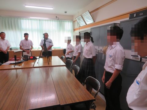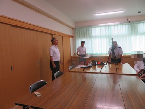 校長先生と司会進行を務める教務担当の先生・情報担当の先生、そして、夏休み中のがんばりで表彰を受ける生徒たちが集まり、スタートしました。
