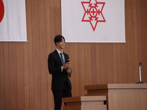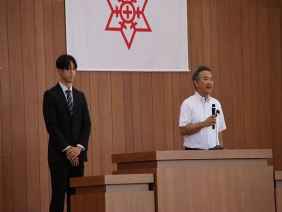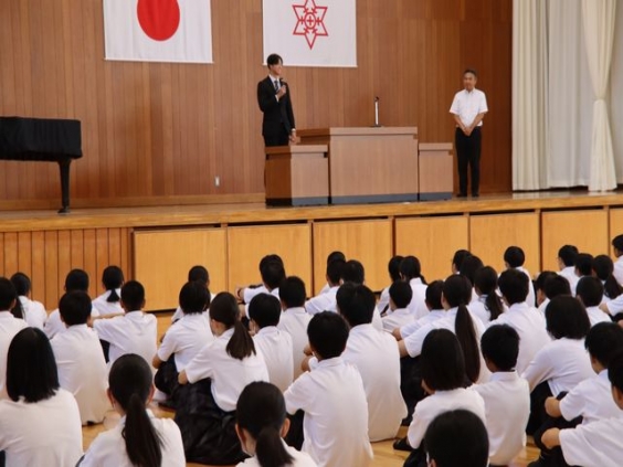教頭 三浦です。 教育実習が始まりました。 3週間の実習です。 全校集会で、校長先生から生徒・職員へ紹介されました。 その後、あいさつをしている様子です。 「3週間と短い期間ですが、皆さんと楽しい時間を共有出来たらと思っています。よろしくお願いします。」と自己紹介されました。