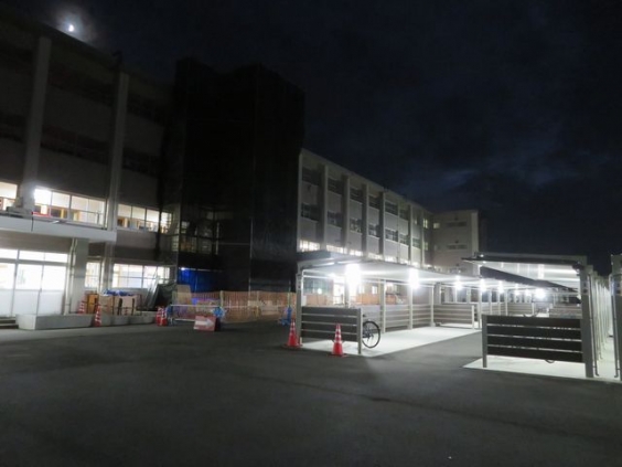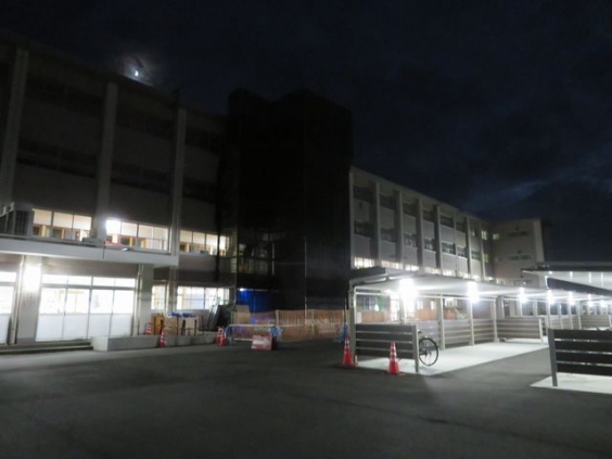 教頭 三浦です。 すっかり日が落ちるのが早くなり、部活動終了時刻も早くなっています。 この写真は、19:00くらいに撮影したものです。 1学期6月頃は、まだまだ明るかった時間帯です。 夜の学校は、たぶん生徒たちは、見ることができない風景であろうと思います。 廊下側からの撮影なので、カーテンがないため、光が漏れてとてもきれいだと感じました。