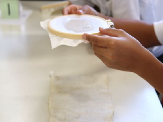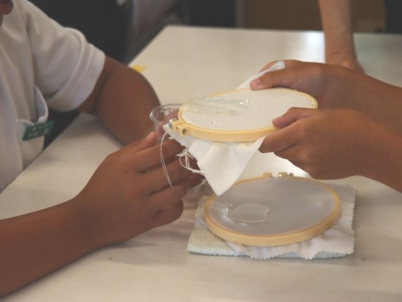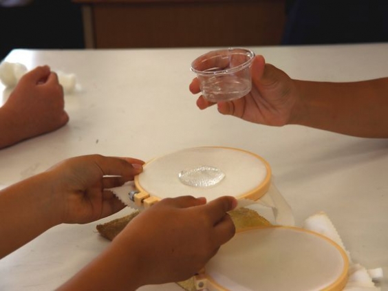 ウールは、撥水性があり、布の上で転がした後は、もとあった容器に水を戻して終わりました。