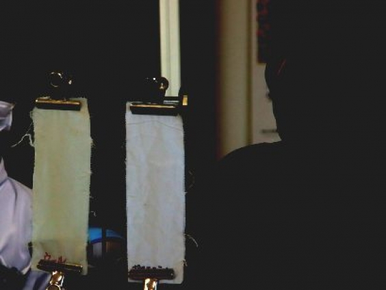 ”バッグの中に入れたままの制服”を模した瓶詰した布が2枚。