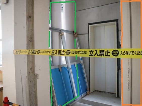 教頭 三浦です。 エレベーター工事の進捗状況です。 仮囲いが無くなり、大きくあいた壁に、仕切りの壁ができました。 たった1日で、こんなにできるとはびっくりです。 この仕切りができたことで、エレベーターホールの大きさがはっきり分かるようになりました。 写真では、オレンジや緑の線で囲まれたところが、今回できた部分です。