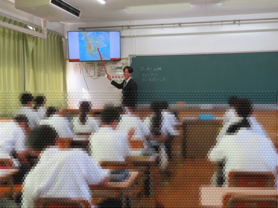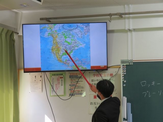 教頭 三浦です。 教育実習生(3週間)が来ております。 教科は社会科です。 この時は、初めての授業の様子を見学させてもらいました。 「地図帳から地名などを探す」というワークをしている場面です。 「見つけた人は手を挙げてね」の声に、生徒たちは一生懸命に地図帳と格闘し、見つけた時は、先を競うように手を挙げていました。 北アメリカ州を学習をしており、気候が東側と西側で違うことなどを楽しそうに学習していました。