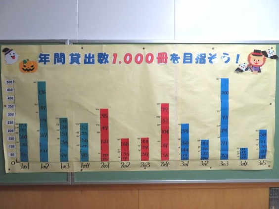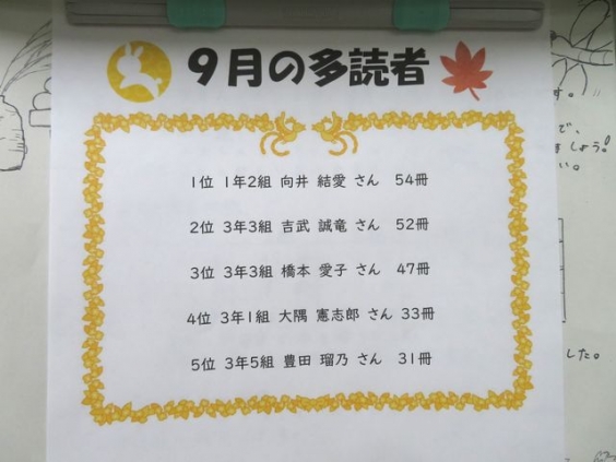 図書室前には、年間貸出数1000冊を目指そう!という掲示板があります。 4月から半年が過ぎ、500冊を超えているでしょうか? なんと超えているクラスが1つありました。 3年3組です。 9月の多読者に名を連ねているのも3年生が多いです。 3年3組の次は、1年2組で497冊と3冊届きませんでした。 友だちとの話のネタに本の話はどうでしょうか? 夜も長くなりました。色々な秋がありますが、読書の秋にしてみてはどうでしょうか?