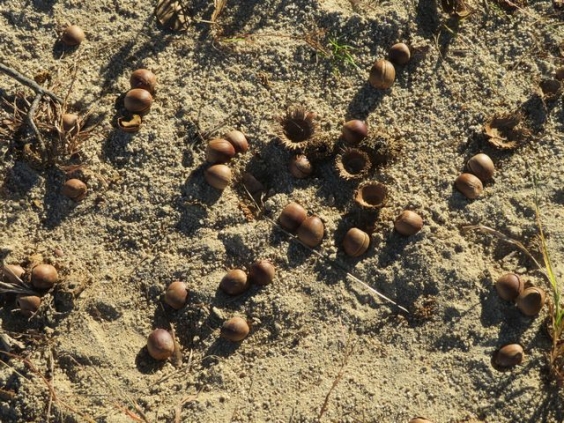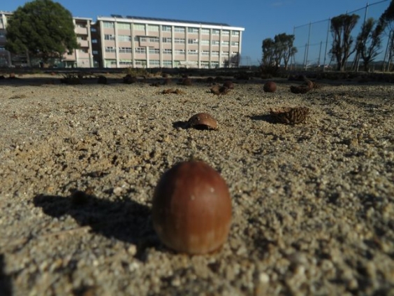教頭 三浦です。 本校のシンボルであるどんぐり(歴木)の樹は、グラウンド南東にあります。 写真1枚目の赤丸で囲った樹です。 天気も良く、暑さもとても和らいだので近づいてみました。 とても大きく育っており、まさに御木ではないかと思います。 樹のすぐ近くでは、足に違和感が・・・ 「何かな?」と思って、下を向くと、ドバーっとどんぐりが落ちていました。 こんなに落ちているとは思わず、Σ( ̄□ ̄|||)ビックリしてしまいました。