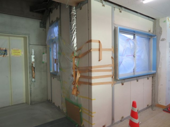 エレベーター工事の進捗状況です。 教頭 三浦です。 最近まで、完全に離れていたエレベーター棟と本館が完全にくっつき一つになりました。 また、窓枠(サッシ)がつきました。 壁の厚さは、現在のままかと思っていたら、窓枠の厚みが20Ⅽmほどもあり、今後壁も厚みを増すことが分かりました。