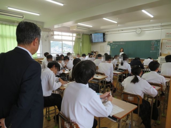 教頭 三浦です。 大牟田市教育委員会より教育長・教育委員をはじめ総勢16名が来校されました。 新しくなった校舎等の見学も兼ねて、授業参観をしていただきました。 私も一緒に参観しました。 各教室での様々な授業で、楽しそうに生徒たちが取り組んでいる姿が見られて、とてもよかったです。 その後、大牟田市教育委員会と話をする機会がありましたが、「子どもたちが明るくく元気」「生徒たちは前向きに取り組んでいた」「ICT(タブレット)の利用方法もスムーズで素晴らしい」など、とても褒めていただきました。