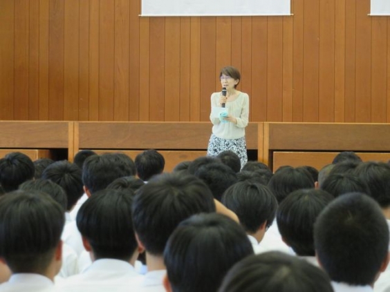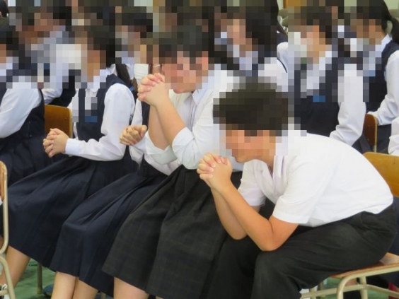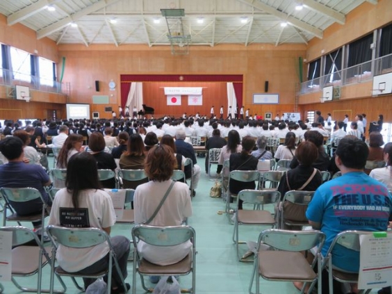 合唱コンクールの表彰は、3年生学年合唱が終わった後に行われました。 各学年金賞のクラスからグランプリが選ばれました。 発表直前は、手を合わせ、祈るようなポーズをとっている生徒がたくさん見受けられました。 講評では、最近まで、大牟田市内で音楽の授業を担当していた本村さんにお願いしました。 銀賞は、銀は金と良いと書く。金よりも良いのである。 銅賞は、胴は金と同じと書く。金と同じである。 と、どのクラスもとてもよかったと褒めていただきました。