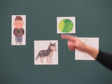 人間(物を運ぶ人)、オオカミ(羊を食べてしまうが、人間がいると大丈夫)、羊(キャベツを食べてしまうが、人間がいると大丈夫)、キャベツの4つを、川の反対側まで渡してほしい。でも、1回に舟に乗れるのは2つ(人間とキャベツやオオカミと羊など)まで。さて、どうやって人間は反対側まで運ぶことができるでしょうか?