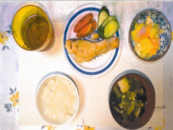 写真2は、矢野 雅明さん作 白ご飯、白身魚のムニエル、ポテトサラダ、味噌汁です。