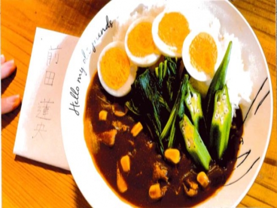 「ほうれん草、オクラ以外にも色々な食材を入れて、バランスの良い料理にし、ゆで卵をきれいに盛り付けました。」材料を見ると、とうもろこしや玉ねぎ、豚肉、オリーブオイルも利用されていました。
