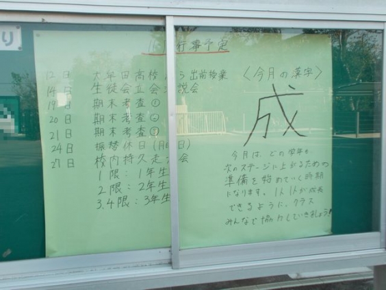 生徒会が掲げる今月の漢字を昇降口近くの掲示板に掲示しています。