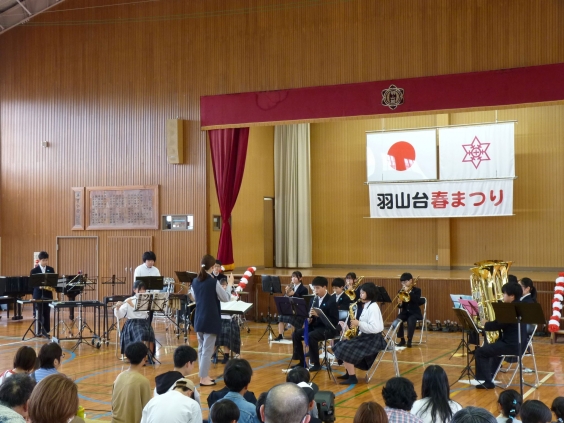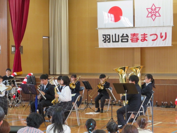 12日、春の陽気の中、第15回羽山台校区春まつりが開催され、多くの参加者で賑わいました。春まつりでは、本校吹奏楽部が「宝島」など5曲の演奏を披露。日頃の練習の成果を地域の方々に聴いていただきました。最後には、アンコールの拍手も起こり、会場を盛り上げてくれました。また、まつりの総合司会を本校生徒ボランティアがつとめ、見事に会の進行を行ってくれました。他にも、琉球舞踊や和太鼓公演、小学生による作文朗読、ダンスなど、盛りだくさんのアトラクションがあり、楽しいイベントでした。会場には、たくさんの御木中学校生徒も訪れており、若い活気を与えてくれていました。羽山台校区の方々からも、「地域の中学生が、たくさんイベントに参加してくれて、私たちも元気をいただきました」との声をいただいています。御木中学校は、地域とともに歩む学校です。これからも、地域と学校が一緒に手をとって、子どもたちを育てていきたいと思います。よろしくお願いします。