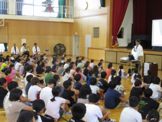 今日は後期の始業式の前に、県堺大蛇山の目玉をいただく式を行いました。県堺大蛇山の練習場所として学校を使わせてもらっている御礼と、本校の創立20周年の御祝としていただくこととなりました。今日は役員の方4名が来校されました。