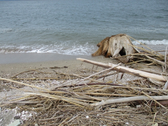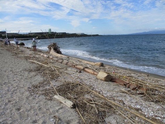 大変風が強い中でしたが、持ってきたレジ袋にごみを入れていました。私の行く前の予想は、ペットボトルが多いのではないかと考えていました。しかし一番多かったのは大雨の時に流れ着いたと思われる細い竹でした。根こそぎ流れてきていることがわかりました。次は木で、中には15mもある根っこのついた木もありました。