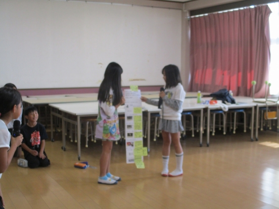 今回は、4つのグループに分かれ、カードをめくってお話を作る活動を行いました。お話は大きめの付箋に書いていき、最後に発表しました。毎回、いろんなアイデアが子供達から出てくるので、すばらしいなあと感じています。