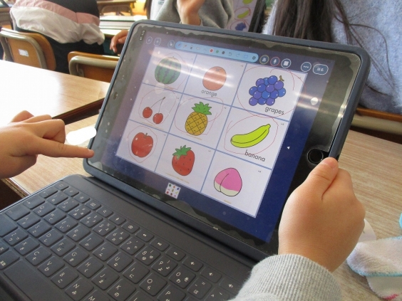 1月13日火曜日 1月8日と9日に各クラスALTのリンダ先生と英語の学習がありました。1年生は回を重ねるごとにリンダ先生にずいぶん慣れ、とても楽しく学習していました。今回の授業ではタブレットを使って9つの果物をマスの中に入れ、リンダ先生が発音した果物に丸を付けていくビンゴゲームでした。様々な果物の単語を発音し、慣れ親しんでいっている様子がよく伝わりました。