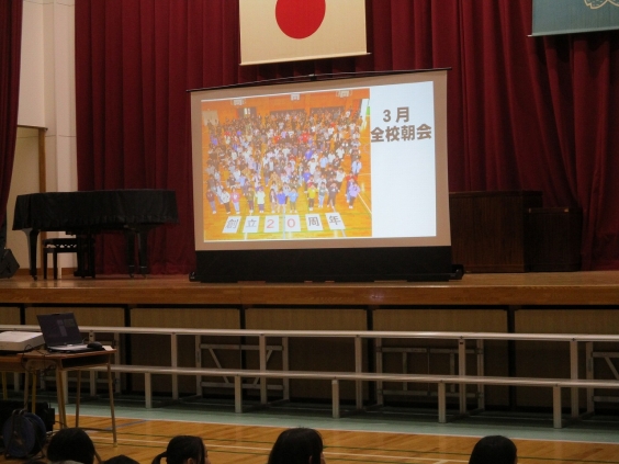 3月3日火曜日 昨日の朝の時間は、3月の全校朝会を行いました。全校児童が揃うのも、この全校朝会が最後です。 今月の生活目標は、「コスモスの合言葉を守って掃除をしよう」です。3月は特に1年間の感謝を込めて掃除をすることが努力点です。 全校朝会は毎回8時35分から開始なのですが、昨日は開始時刻の1分前にはおしゃべりもなく整列し、静かに待つことができていました。このような姿に成長していったのは、子供達に、常日頃丁寧に指導を重ねていっている担任の先生方のお陰です。