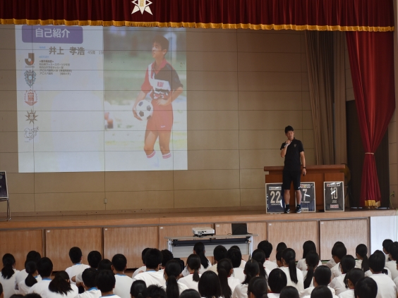 9月19日(金)午後、アビスパ福岡のアカデミーダイレクター井上孝浩さんをお招きし、ドリーム講話を行いました。講話の中で、井上さんは「ポジティブに物事を捉える眼と考え方をもってほしい」「やると決めたらあきらめない、貫く強い意思をもとう」と夢や希望をもつ大切さや何かに夢中になる素晴らしさについて、お話してくださいました。放課後はサッカー部の練習にも参加し、ご指導いただきました。自己の生き方や今後の進路選択について真剣に考える、良い機会となりました。