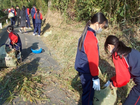 11月14日(金)、今年度2回目の通学路除草作業を行いました。当日は、朝9時から地域の方々に学校西側の米生坂から学校までの道路脇に生い茂った雑草を刈っていただきました。そして、午後、全校生徒がその雑草等をボランティア袋に集めていきました。地域の方々と生徒たちとの協働作業により、安全に通行できる通学路になりました。ありがとうございました。