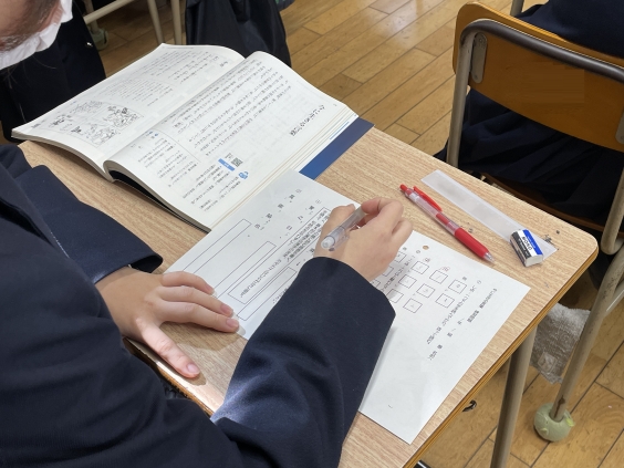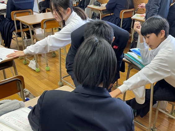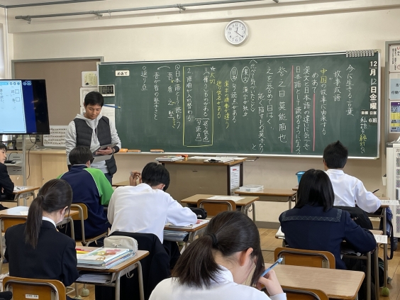 現在、第1学年国語科では、「今に生きる言葉」という単元で漢文の学習を行っています。この日は、漢文と日本語(書き下し文)の表記の違いに気づき、返り点(レ点や一二点)の意味を理解し、送り仮名や句読点を適切に補って訓読文にすることができるように、返り点の持つ意味や用法を確認した上で、基礎や応用の問題に取り組みました。生徒たちは、個別に演習問題に取り組んだ後、ペアやグループに分かれてお互いに教え合いながら学習内容を理解していく姿が見られました。