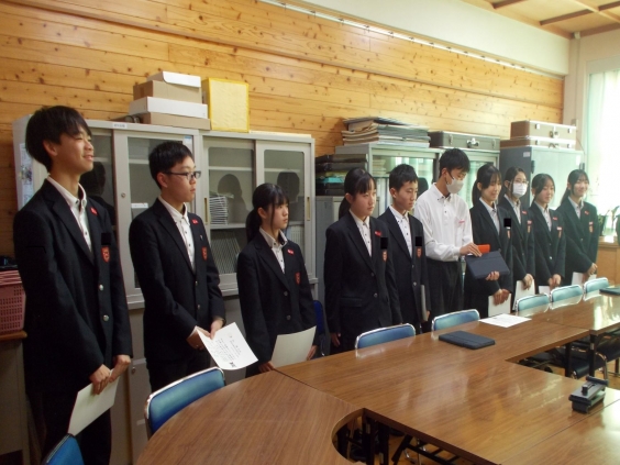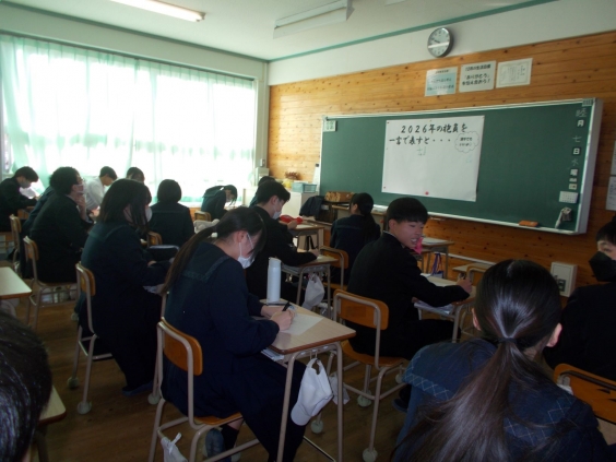 1月7日(水)、インフルエンザ等の感染防止のため、令和7年度第3学期の始業式をリモートにて開催しました。新年を迎えるにあたり、校長先生が書き初めされた「雲外蒼天(うんがいそうてん)」の意味(雲の上には晴れ渡る青空があるように、苦難を乗り越えた先に明るい未来が待っている)に触れられながら、生徒の皆さん一人ひとりが「みずから雲という“困難”を突き破ったその先には蒼い天が見える」、そんな1年にしてほしいという話がありました。続いて生徒会役員任命式では新生徒会を代表し、校長先生から田中会長に任命証が手渡されました。その後の全校集会では、生徒会役員一人ひとりが元気に就任の挨拶を行いました。生徒の皆さんにとっても飛躍の一年となるよう期待しています。