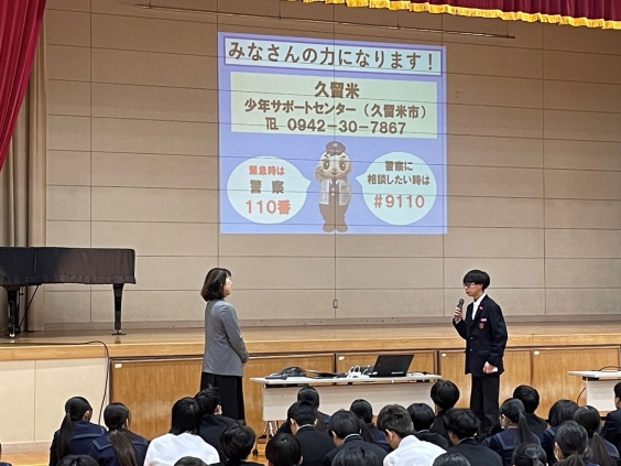 2月16日(月)の4校時、福岡県警察本部暴力団対策部から講師をお招きし、「暴力団排除教室」を行いました。この取組は、福岡県内のすべての中学校、高等学校等を対象として、生徒たちに「暴力団の犯罪に遭わない、暴力団員にならない、犯罪行為に加担しない。」といった意識を醸成し、将来的には「暴力団が存在しない福岡県」の実現を目指すために実施されています。講話の中で、SNSが暴力団との接点になる可能性が高いことやもし、闇バイトや違法薬物使用に誘われたら、きっぱり断ってその場から立ち去ることなどを教えていただきました。感想には、「簡単にお金を稼げる仕事はないし、仕事の内容がわからないようなバイトは絶対にしない。」「SNSでたくさん闇バイトが募集されていることを知り、身近なところにも危険があるので気を付けたい。」という意見が多く見られました。