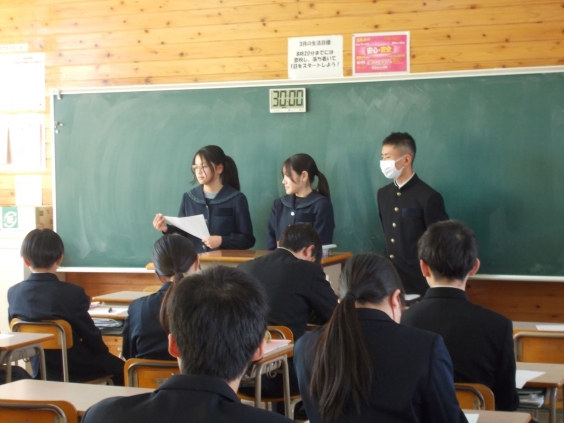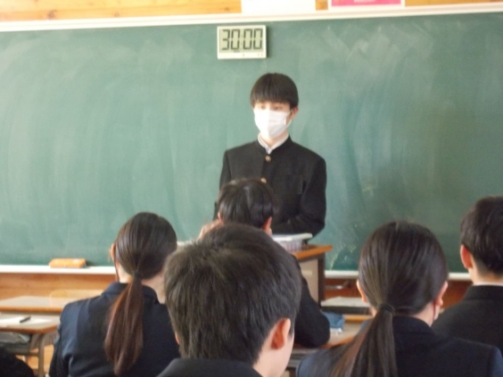 3月9日(月)午前、1・2学年の総合的な学習の時間に、卒業を直前に控えた3年生9名が各教室をまわり、中学校生活で大切にしてきたことについて語る「先輩に学ぶ」を行いました。3年生は、学校行事や部活動、そして毎日の授業にどのように向き合ってきたのか、自身の体験をもとに丁寧に話してくれました。希望する進学先に合格した先輩たちの言葉には説得力があり、後輩たちは真剣なまなざしで耳を傾けていました。 この時間は、今後の学校生活を前向きに頑張ろうという気持ちを一層強くする、貴重な学びの機会となりました。