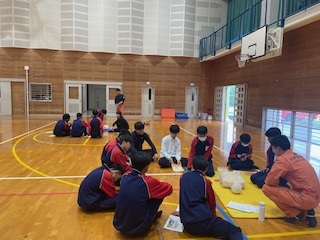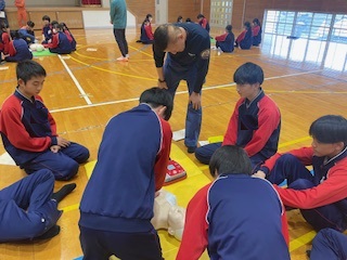 4月14日(火)、3年生対象の救急救命講習を実施しました。事前にビデオでの講習を行った後、大牟田市消防本部の方々から、AEDの使い方や意識がなくなった方への対応、心肺蘇生について直接ご指導いただきました。命を救うために、改めて「早く、的確に行動できること」の大切さを学ぶことができました。