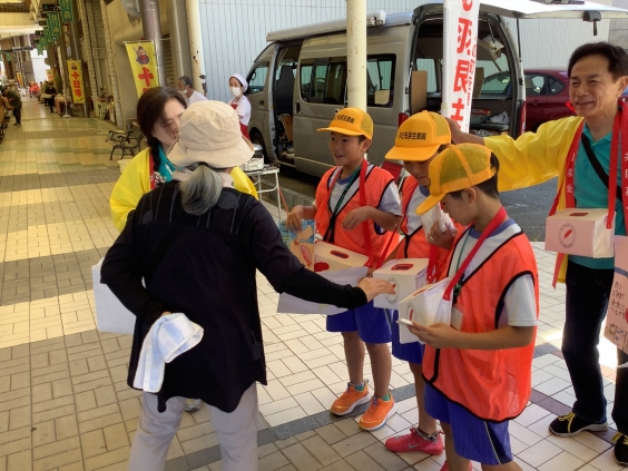 10月10日(金)、5年生が子ども民生委員として銀座通り商店街の十日市に参加し、赤い羽根共同募金活動を行いました。9月25日(木)に社会福祉協議会の永江様と一緒に学習したことを生かして、呼びかけのポスターやお礼の手紙を作ったり、募金の呼びかけの練習をしたりして準備を進めてきました。最初は恥ずかしそうに呼びかけをしていた子どもたちも、募金をしてもらうとだんだん声も出るようになりました。活動が終わった後の子どもたちは、校区のために自分たちにできることをやり遂げ、達成感に満ちていました。ご協力していただいた皆様、ありがとうございました。