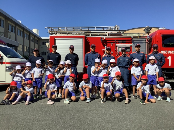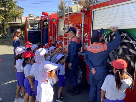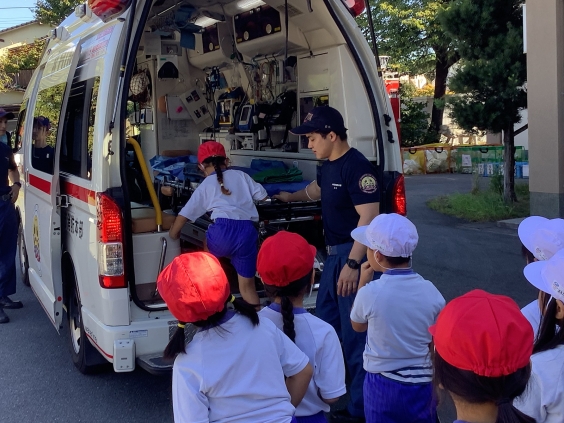 先日、大牟田消防署より、1年生の国語科「じどうしゃくらべ」の学習のために、消防隊と救急隊の方が来てくださいました。1年生の子どもたちは、消防車や救急車についていろいろなことを教えていただき、たくさんのことを学びました。「消防車の中を見て、ホースがとても長くてびっくりしました。」「救急車の中は、いつでも人を助けられる準備ができていてすごいと思いました。」と大興奮。その後、自分の興味をもった自動車図鑑を作り、自分だけの素敵な図鑑ができました。