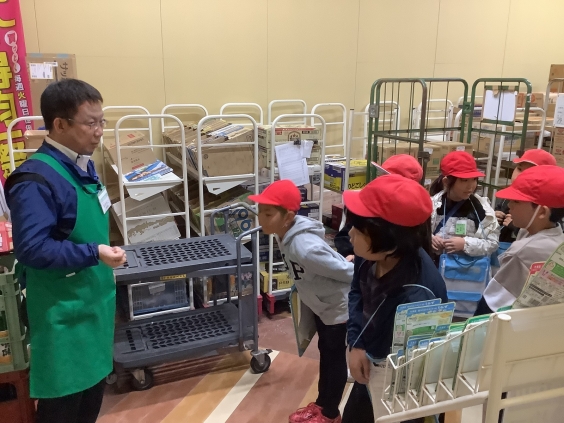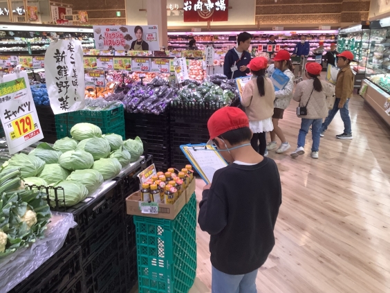 11月5日(水)3年生は、社会科「はたらく人とわたしたちのくらし」の学習で、マルミヤストアにスーパーマーケットで働く人たちの工夫を調べに行きました。「値段」「新鮮さ」「品ぞろえ」「便利さ」の4つのキーワードで調べることを明確にしながらお店の中を見学しました。「スーパーマーケットに人がよく来る理由は、特売日などの安い日があるからだな。」「野菜や魚、肉などは、朝来てその日のうちに出しているんだな。」「いろんなところから品物を取り寄せているんだな。」と、気づいたことを発表したり、まとめたりしていました。学校では、スーパーマーケット以外の場所にも目を向け、お店の仕事や買い物の仕方について調べていきます。