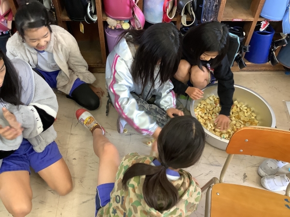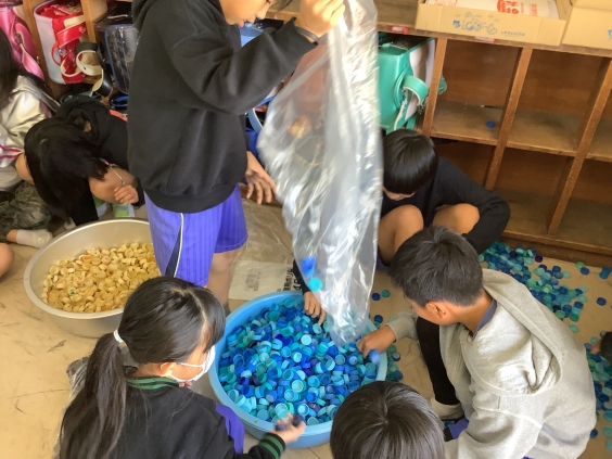 11月26日(水)に、これまでに集めたペットボトルキャップを5年生が色分けしてくれました。このペットボトルキャップは3月に坂西医院に持って行き、海外支援団体の活動に役立ててもらいます。保護者の皆様、地域の皆様、いつもたくさんのキャップを持ってきていただきありがとうございます。引き続き、少しでも多くのペットボトルキャップを集めることができるよう、ご協力をよろしくお願いします。