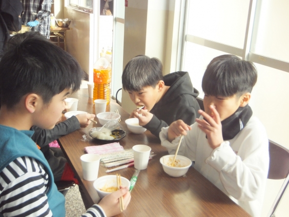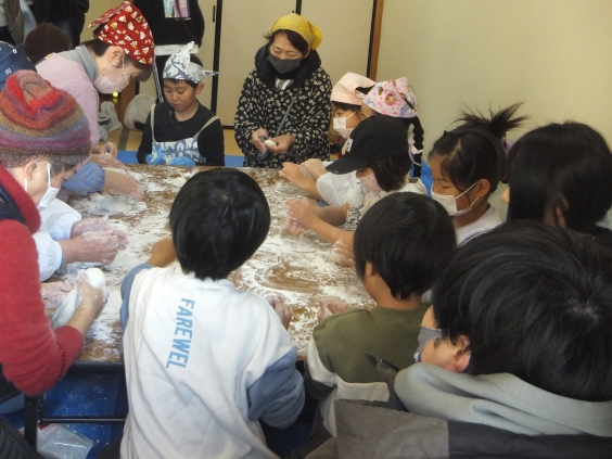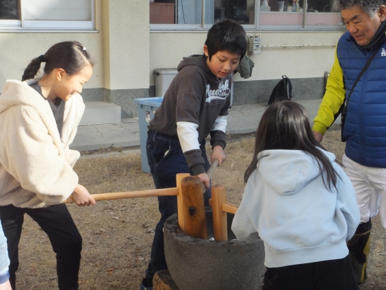 1月11日(日)に、中友校区ふれあいもちつき大会が行われました。雪の降る寒い中ではありましたが、地域の皆様や保護者の方のご協力で、子どもたちはもちをついたりまるめたりして素敵な体験をさせていただきました。ついたお餅は、きなこ餅、ぜんざい、雑煮へと変わり、子どもたちは「おいしい!」とにこにこ笑顔で何回もおかわりをして食べていました。前日から準備していただいた皆様、当日ご協力していただいた皆様、本当にありがとうございました。