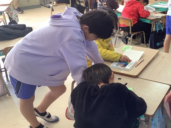 2月末にはお別れ集会があります。それに向けて、2月3日(火)に1〜5年生が縦割班で集まり、6年生へのありがとうカードを書きました。「一緒にサッカーをしてくれて楽しかったです。」「わからないときに優しく教えてくれて嬉しかったです。」など、ありがとうの気持ちがたっぷりこもったメッセージカードがたくさんできあがりました。メッセージカード書きを進めてくれたのは5年生。下学年に寄り添って一緒に書いていた姿が頼もしかったです。お別れ集会には、体育館後方に掲示されます。楽しみにご覧ください。