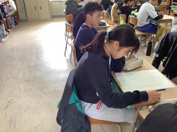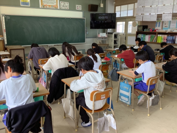 3月3日(火)基礎タイムに、計算検定テストを行いました。今年度最後の検定テストだったので、どの学年の子どもたちも上位をねらう真剣な表情で開始を待っていました。検定テストの5分間は真剣に問題と向き合い、鉛筆の音だけが響き渡るすばらしい集中力でした。5分間を終えると、「1分切った!」「全問正解だった!」と達成感あふれる声が飛び交いました。後日表彰式を行います。