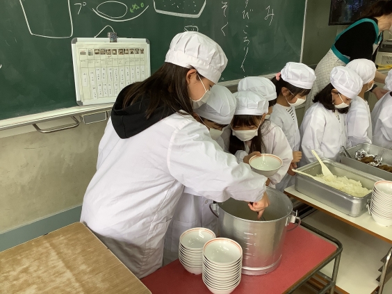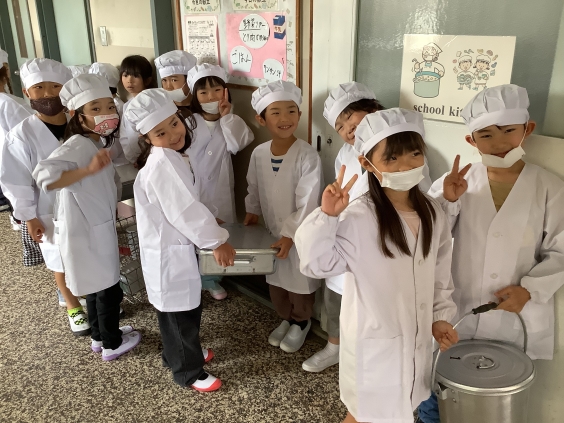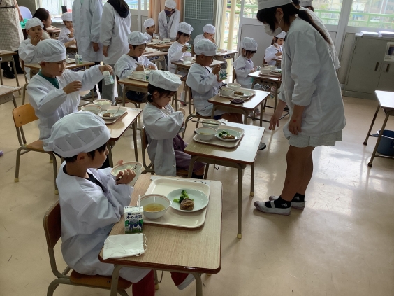 4月17日(金)1年生が初めての学校給食を経験しました。今日は初めてだったので、6年生のお兄さん、お姉さんが準備の仕方や給食のつぎ分け方等丁寧に教え、おいしい給食をいただきました。「ハンバーグおいしい!」「野菜は少し苦手だったけど頑張って食べた!」と、大満足の給食だったようです。片付けは6年生が見守りながら、1年生が自分たちで行うことができていました。栄養満点の給食を食べて元気に過ごしてほしいと思います。